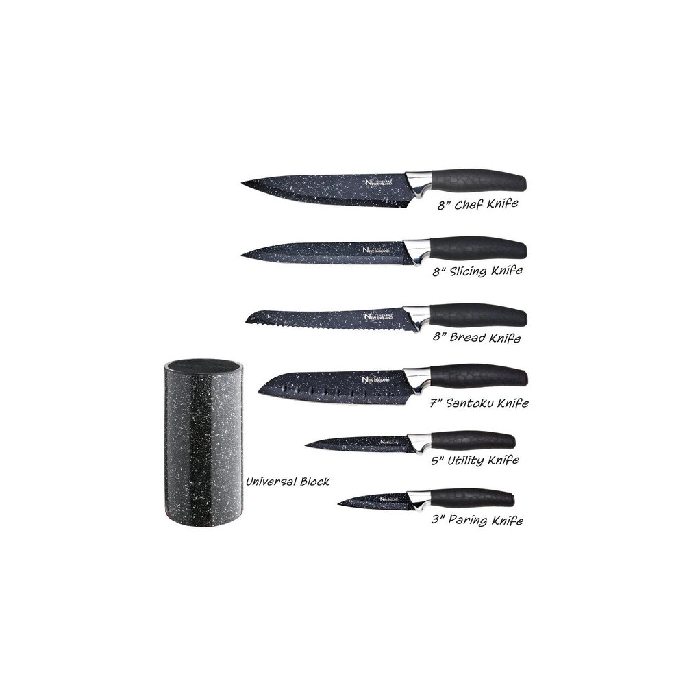 A 6 knife cutlery set from New England. Crafted from high-carbon steel and coated in a non-stick marble finish, these blades are well-balanced and maintain their razor-sharp edge.